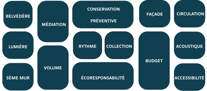Vous êtes prêt à découvrir la scénographie du nouveau musée ? Plongez dans la réflexion du scénographe à travers le glossaire scénographique interactif. Retrouvez toutes les notions clés du projet, et rentrez dans ses coulisses. Cliquez sur un mot pour découvrir sa définition, son rôle dans le nouveau musée, et aussi la parole des scénographes, qui donnent vie aux concepts !